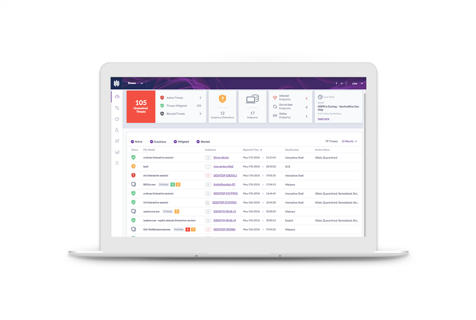 SentinelOne komt met een krachtig en overzichtelijk dashboard. U heeft een totaal overzicht over al uw werkplekken en servers waarop SentinelOne geïnstalleerd is. In één oogopslag ziet u waar een eventuele aanval heeft plaatsgevonden en hoe deze is afgeslagen.